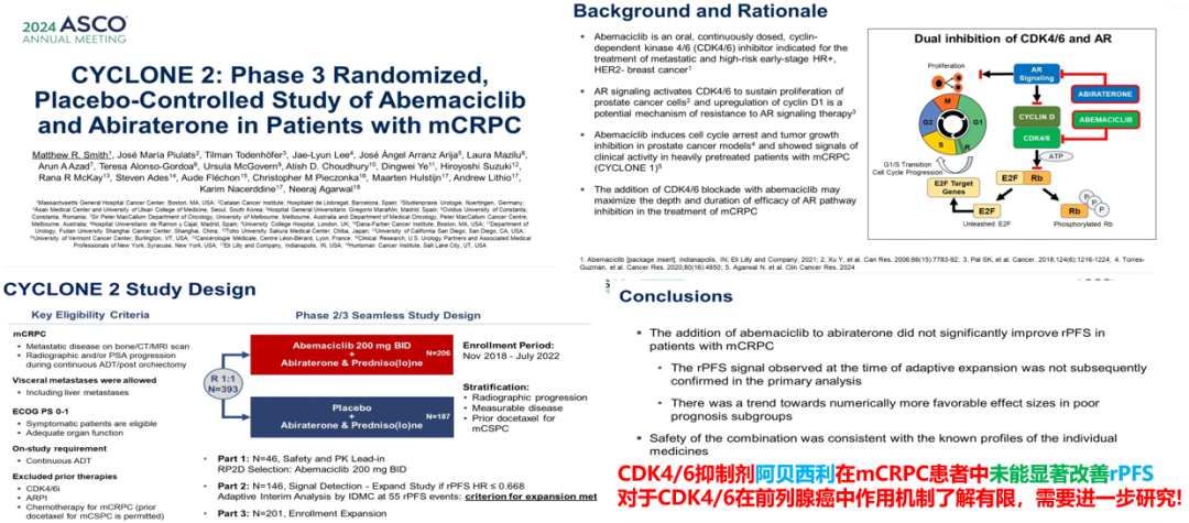 既往研究表明,CDK4/6对于维持雄激素受体(AR)信号传导、失控增殖和激素耐药发挥关键作用。这项CYCLONE 2研究表明,虽然CDK4/6抑制剂阿贝西利联合治疗体现了与单药一致的良好的安全性,但是并未显著增加mCRPC患者rPFS,此外在研究次要终点OS方面也未有显著改善,需要进一步探索。