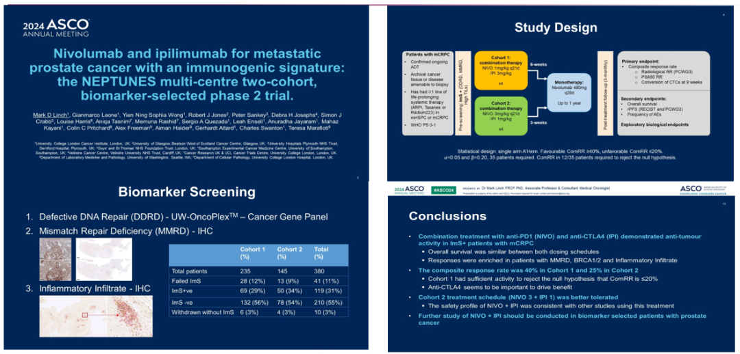 对于前列腺癌患者而言,既往的单一免疫治疗获益有限;但近期研究表明,免疫联合治疗在mCRPC患者中显示出较高的抗肿瘤活性。这项NEPTUNES研究分析了不同免疫联合策略治疗mCRPC患者的疗效,结果表明,炎症浸润可作为潜在的前瞻性预测生物标志物,用于分析既往接受过治疗的mCRPC。尽管纳武利尤单抗1 mg/kg+伊匹木单抗3 mg/kg的毒性大于纳武利尤单抗3 mg/kg+伊匹木单抗1 mg/kg组,但疗效更好。
