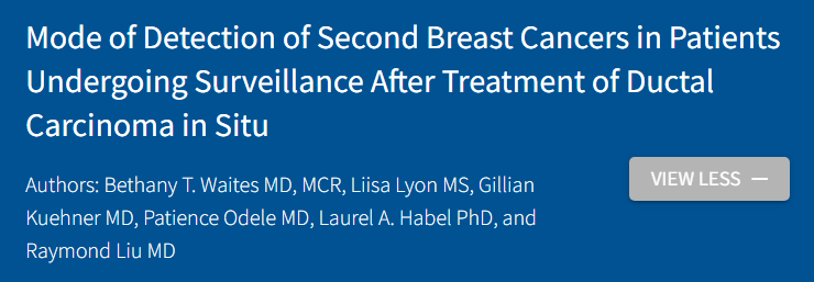 导管原位癌(DCIS)占新诊断乳腺癌的25%[2],绝大多数(估计>97%)患者经治后生存良好;然而超过20%的DCIS患者在初诊后10年内会出现同侧乳房第二肿瘤,其中一半具有侵袭性[2,3];并且这部分患者的对侧侵袭性乳腺癌的发生风险也会增加。因而NCCN乳腺癌临床实践指南(NCCN指南)进行了针对性推荐[5],以降低DCIS患者复发和第二肿瘤风险。此外,早期研究显示临床乳房检查(CBEs)只能检测到15%的复发[6-8],而且还没有当代的大型系列研究描述DCIS患者复发或第二次乳腺癌的检测方式。