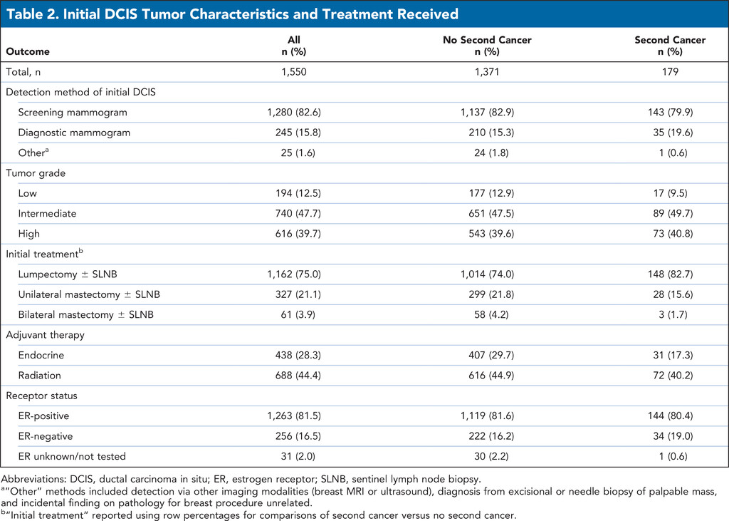 这项研究进行了回顾性队列分析,研究对象为2008年1月1日至2011年1月1日期间被诊断和治疗的18岁及以上、单侧DCIS、随访至少10年的女性患者。纳入的患者随访时间至少5年,其中62%的患者随访时间超过10年。在随访期内,那些在任何部位(包括双侧乳房、胸壁、腋窝淋巴结或远处部位)发展出DCIS和/或侵袭性肿瘤的患者被识别出来,并使用“第二次乳腺癌”这个术语描述该亚组。