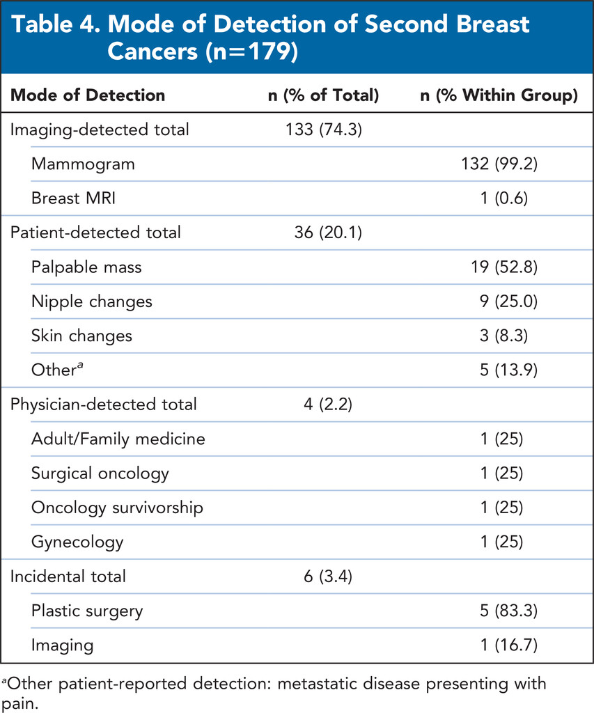 在这项中位随访时间为10年的回顾性研究中,发现94.4%的第二次乳腺癌是通过乳腺X线检查或患者报告症状发现,只有2.2%的第二次乳腺癌通过常规临床乳腺检查发现。