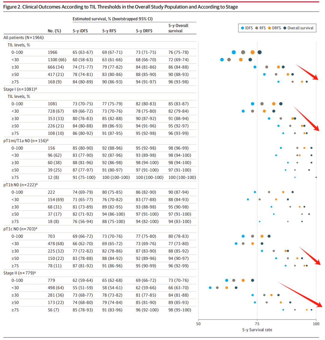 在1966例患者中包含779例Ⅱ期TNBC患者,Ⅱ期TNBC患者的5年iDFS率为62%(95%CI,59%-64%),RFS率为65%(95%CI,62%-68%),DRFS率为69%(95%CI,66%-72%),总生存率为73%(95%CI,70%-76%)。特别值得指出的是,TIL水平≥75%的56例患者5年iDFS率为85%(95%CI,78%-93%),RFS率为91%(95%CI,83%-96%),DRFS率为96%(95%CI,92%-100%),总体生存率为98%(95%CI,95%-100%)。
