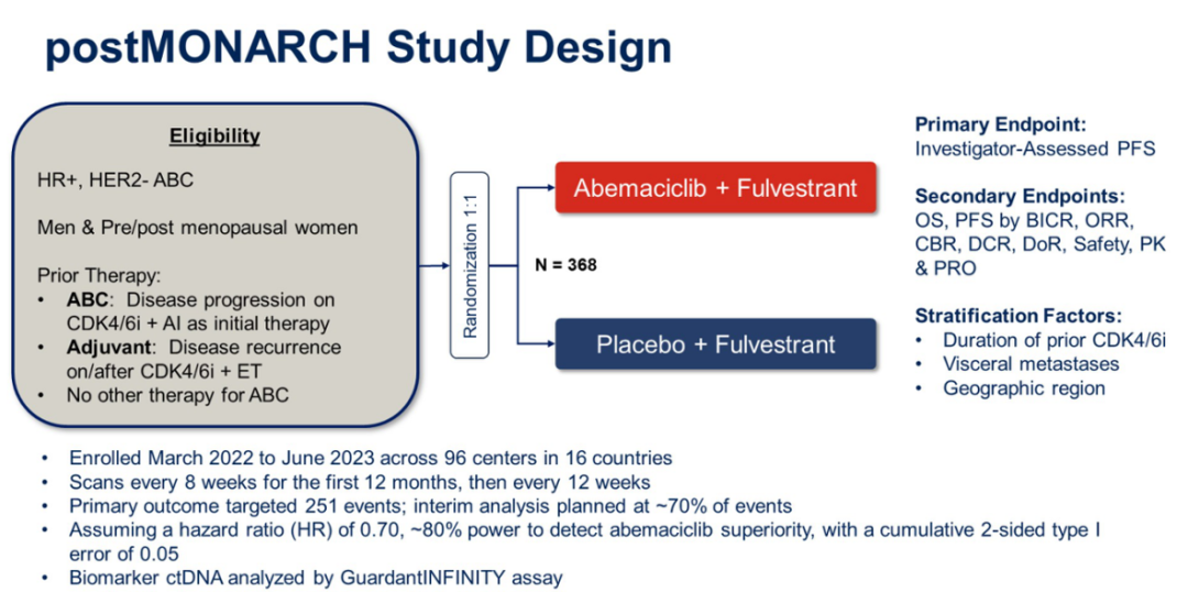 编者按:postMONARCH是首个随机、安慰剂对照的3期研究,2024年ASCO大会上,埃默里大学Winship癌症研究所Kevin Kalinsky博士公布了postMONARCH研究的主要结局,结果显示在CDK4/6i治疗进展后,继续使用abemaciclib(阿贝西利)+氟维司群进行治疗,患者会有获益。本文特将该研究进展进行介绍,以飨读者。