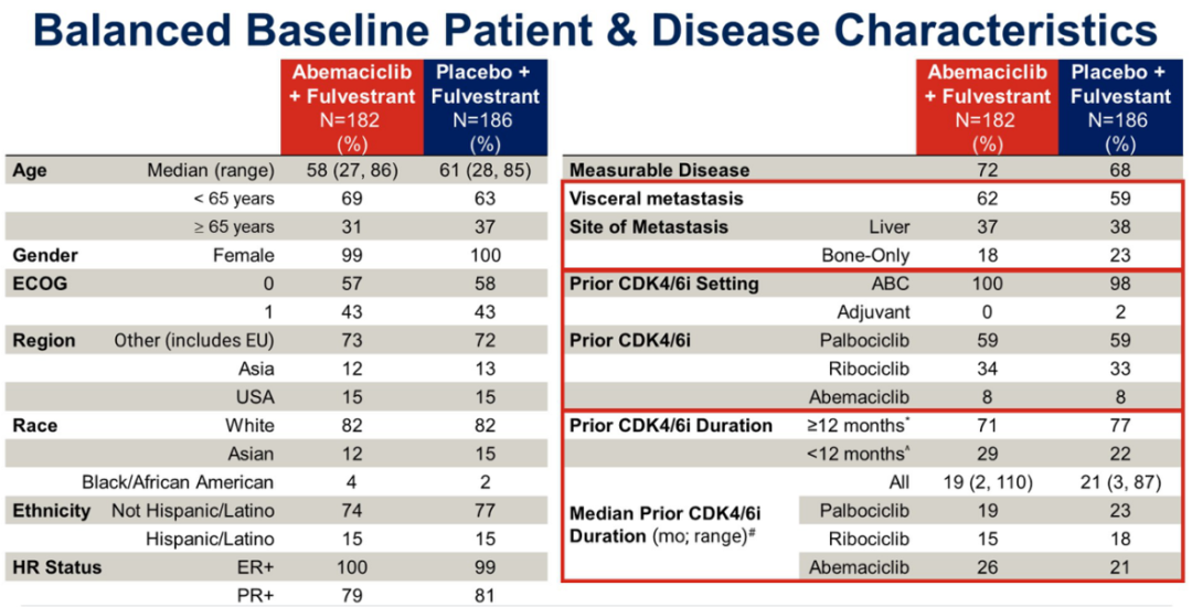 共368例患者被随机分配接受阿贝西利+氟维司群(n=182;阿贝西利组)或安慰剂+氟维司群(n=186;安慰剂组)治疗。大多数晚期乳腺癌患者(99%)在CDK4/6i+ET作为初始治疗后直接纳入临床试验。两组患者中既往59%的患者接受过哌柏西利(palbociclib)治疗、8%的患者接受了阿贝西利治疗;阿贝西利组中34%的患者接受了瑞波西利,安慰剂组中33%的患者接受了瑞波西利治疗。