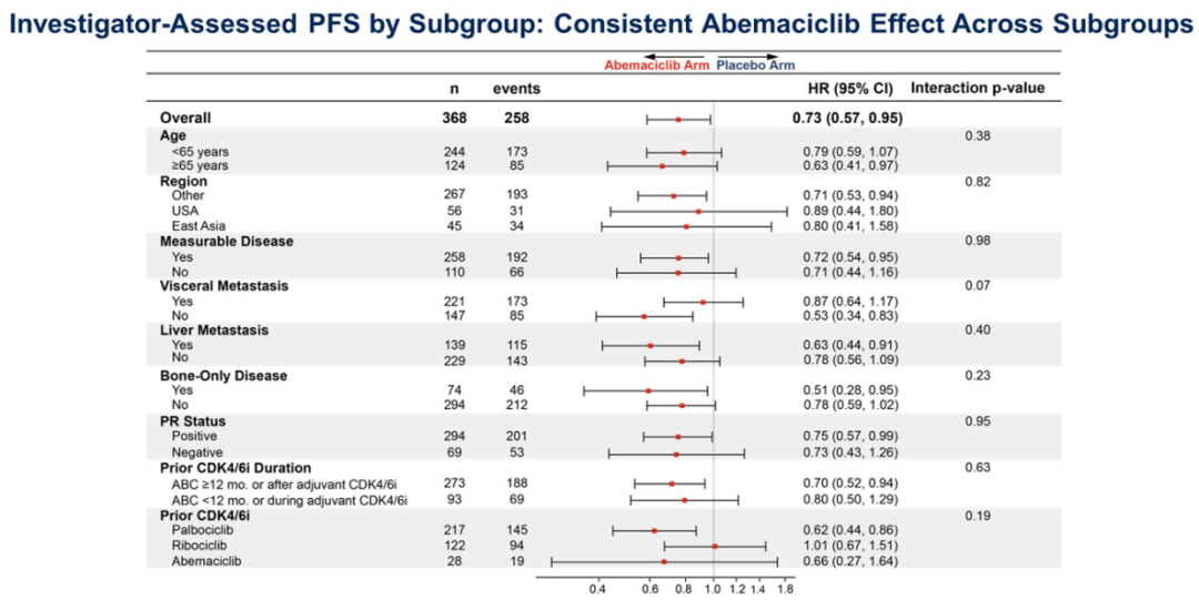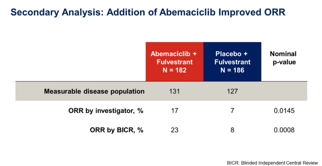 在主要的临床和基因组亚组(包括基线时有ESR1或PIK3CA突变的患者)中观察到一致的效应。阿贝西利组的ORR优于安慰剂组(在有可测量疾病的患者中,ORR分别为17%和7%)。根据BICR的PFS也有所改善,HR=0.55(95%CI:0.39~0.77)。OS仍不成熟(20.9%的事件发生率)。安全性与阿贝西利已知的特征一致。