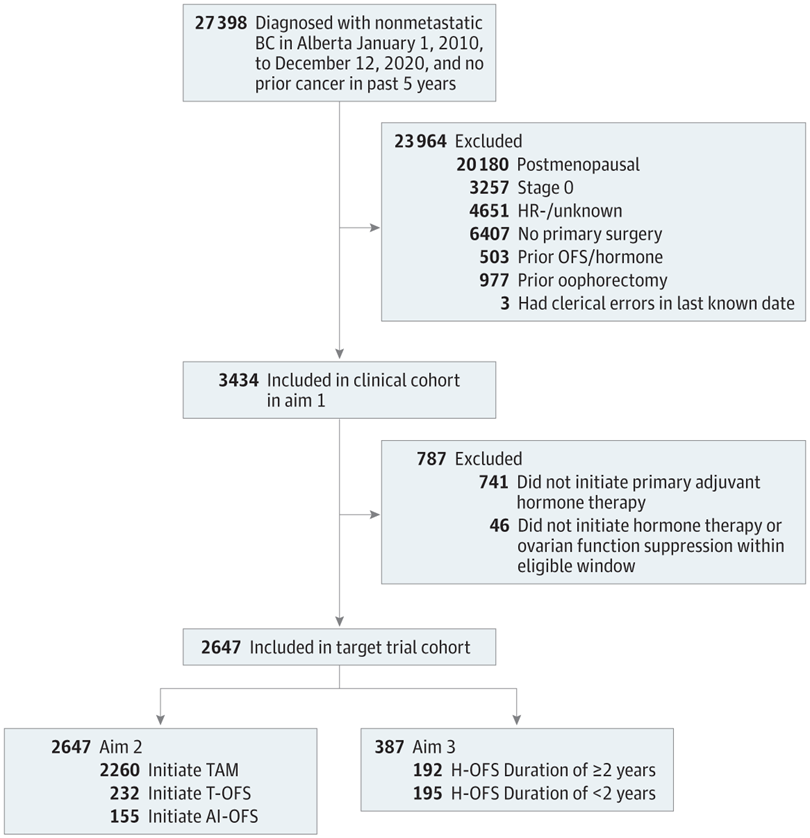 约3/4乳腺癌患者存在雌激素受体表达或/和孕激素受体表达(统称为激素受体阳性,HR+),这类患者需要进行内分泌辅助治疗[6];对于复发风险较高的女性,欧美等国家指南建议OFS联合他莫昔芬或芳香化酶抑制剂作为优选方案[3,4];目前需要进一步评估OFS的疗效。一项加拿大的研究针对HR+绝经前乳腺癌患者进行了研究,研究目标包括以下3方面:描述内分泌和OFS辅助治疗起始时间和持续时间,比较3个治疗组(他莫昔芬联合OFS辅助治疗、芳香化酶抑制剂联合OFS辅助治疗、他莫昔芬单药治疗)的无复发生存期,并估计OFS辅助治疗持续时间与RFS的相关性。