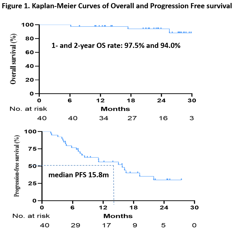 40例患者中的不良事件(AE)发生率85%,但大部分AE为0~2级;仅2例为3级AE,并且经过临床医生管理后患者可以接受后续治疗。主要AE为肝功能异常、血小板下降等。