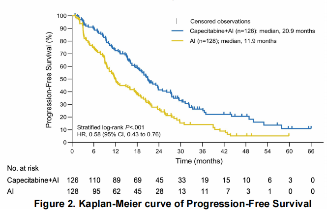 在这项多中心、随机研究中,263例既往未接受过转移性全身治疗的HR+/HER2-晚期乳腺癌女性患者以1∶1的比例被分配接受节拍卡培他滨(500mg,每日3次)+内分泌治疗(AI)或内分泌(AI)单药治疗。主要终点是研究者判定的PFS。中位随访50.7个月,节拍卡培他滨+AI组中位PFS为20.9个月,AI组中位PFS为11.9个月(HR 0.58;95%CI:0.43~0.76)。