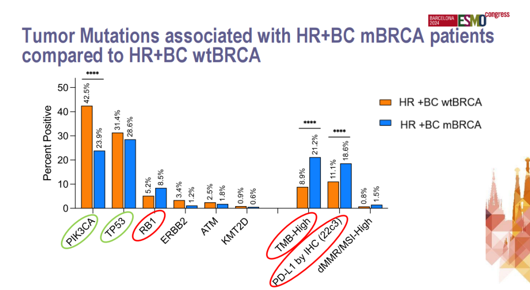 通过测序对HR+MBC mBRCA+(与WT相比)进行的分子分析显示,PIK3CA突变更多,NK细胞、巨噬细胞M2和CD8 T细胞富集,中性粒细胞减少(所有P<0.05)。与WT相比,mBRCA+有更高比例的TMB-High和PD-L1+。与TMB-Low相比,mBRCA+的TMB-High患者OS最差(HR=1.47,95%CI:1.14~1.89;P<0.003),但不同PD-L1表达OS无差异(HR=0.84,95%CI:0.52~1.36)。结果显示,同时合并mBRCA+和PIK3CAm患者的OS最差。