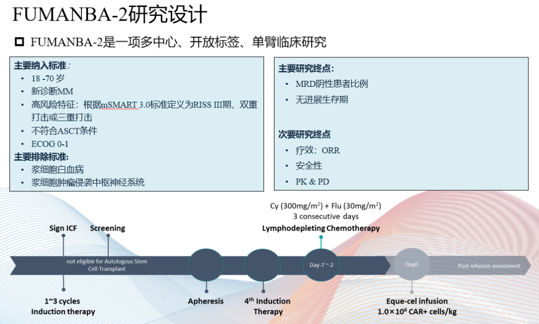 FUMANBA-2是一项针对高危NDMM患者的多中心、单臂、开放标签的Ⅰ期临床研究。研究纳入18至70岁的成人初诊MM患者,根据mSMART 3.0标准被定义为具有高风险特征,包括RISS III期、双重打击或三重打击,且不适合进行ASCT。主要研究终点是MRD阴性患者的比例和无进展生存期(PFS),次要研究终点包括客观缓解率(ORR)、缓解持续时间、安全性、药代动力学和药效学。患者入组后将完成4个周期的诱导治疗,在第3个诱导周期后完成移植资格的评估,不适合移植的受试者将进行单个核细胞采集术,随后完成第4个周期的诱导治疗。不同于FUMANBA-1研究,本研究人群整体耐受性差,故对伊基奥仑赛回输后的预处理方案进行了调整,受试者将接受连续3天的环磷酰胺300 mg/m2和氟达拉滨30 mg/m2,随后完成1.0×106 CAR+cells/kg剂量的细胞回输。
