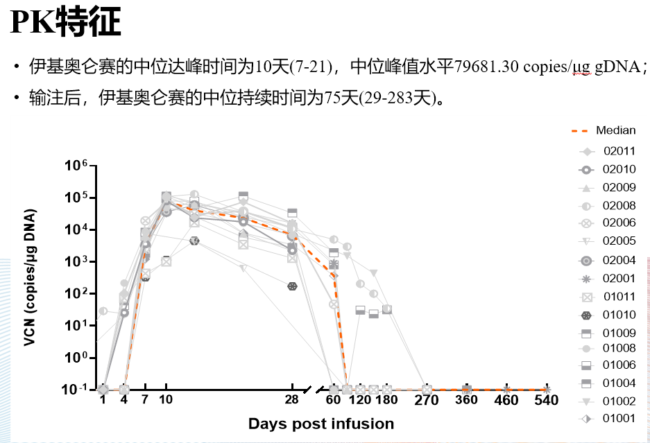 药代动力学方面,伊基奥仑赛的中位达峰时间为10天(7-21),中位峰值水平为79681.30 copies/μg gDNA。细胞输注后,伊基奥仑赛的中位持续时间为75天(29-283天)。