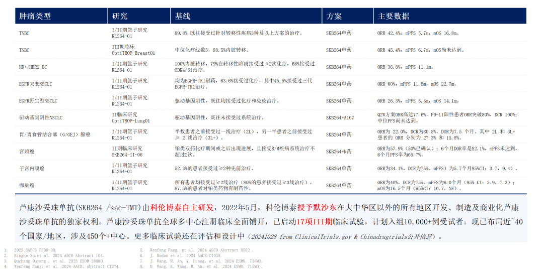 对于HR+/HER2-mBC芦康沙妥珠单抗同样表现抢眼,2023年ESMO大会,公布了其用于经过多线治疗的HR+/HER2-mBC的初步结果(数据来自KL264-01篮子研究),疗效令人欣喜,ORR高达36.8%,mPFS长达11.1个月。同时,整体安全性可管可控,最常见的是血液学不良反应。不仅如此,2024年8月19日,芦康沙妥珠单抗用于治疗经EGFR-TKI和含铂化疗治疗失败的EGFR突变局部晚期或转移性非小细胞肺癌(NSCLC)的新药申请(NDA)获国家药品监督管理局(NMPA)药品审评中心(CDE)受理,并纳入优先审评。同年10月31日,芦康沙妥珠单抗用于治疗EGFR-TKI治疗进展的EGFR突变局部晚期或转移性NSCLC的新药申请获CDE受理并纳入优先审评。未来随着两项适应症的获批,芦康沙妥珠单抗有望改变EGFR-TKI耐药后晚期NSCLC患者的治疗格局。同时,芦康沙妥珠单抗在妇科肿瘤和消化道肿瘤也相继取得了出色的成果。芦康沙妥珠单抗展现出了同类最佳的潜质,立足于临床巨大的未被满足的治疗需求,科伦博泰携手默沙东已注册开展了17项III期临床试验(20241028 from ClinicalTrials.gov&Chinadrugtrials公开信息),探索芦康沙妥珠单抗在不同肿瘤、不同疾病阶段、不同治疗策略的疗效和安全性。随着临床试验项目不断地加码和加速,芦康沙妥珠单抗有望成为治疗多种肿瘤的重磅药物。