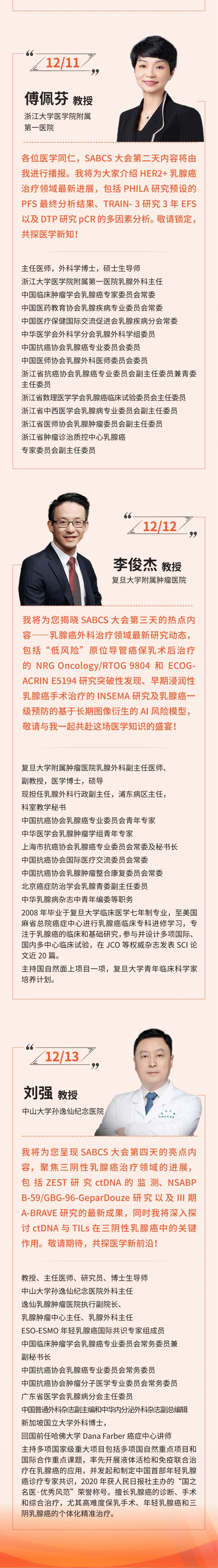 为深度报道此次盛会,《肿瘤瞭望》特此开设“瞭望联播”专栏,并荣幸邀请到江苏省人民医院殷咏梅教授担任特邀观察员。在会议期间,殷教授将连线SABCS现场的中国专家——复旦大学附属肿瘤医院张剑教授、浙江大学医学院附属第一医院傅佩芬教授、复旦大学附属肿瘤医院李俊杰教授、中山大学孙逸仙纪念医院刘强教授(按预计连线日期排序),每日实时传递会议的重磅研究成果与亮点发现。诚邀各位读者密切关注“瞭望联播”和《肿瘤瞭望》推出的栏目,共同见证SABCS大会的最新前沿进展,洞悉乳腺癌研究领域的未来趋势!