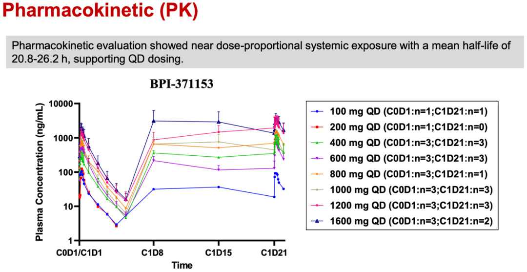 BPI-371153半衰期20.8-26.2小时,支持QD给药,可提高患者使用依从性,药物暴露表现出剂量依赖性,为后续开发的剂量选择提供有力支持。
