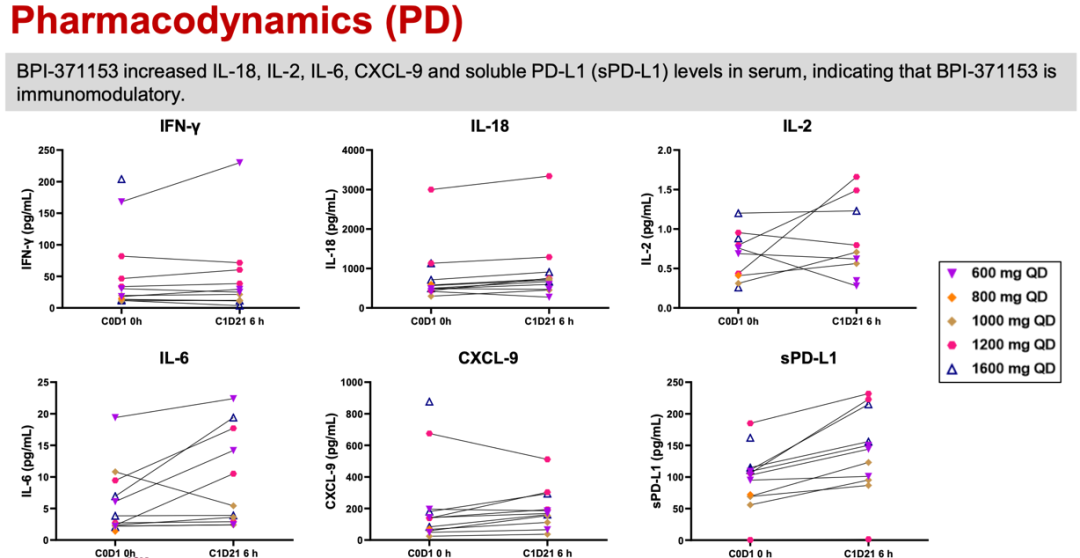 药代动力学与药效动力学:药代动力学显示血浆暴露量随剂量增加近似呈线性增长,平均半衰期为20.8-26.2小时,支持QD给药。药效动力学数据显示,BPI-371153具有免疫调节作用,增加了IL-18、IL-2、IL-6、CXCL-9和可溶性PD-L1水平。(图3)