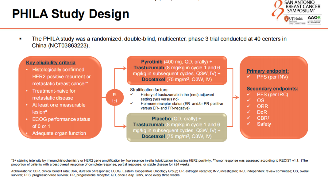 在HER2阳性乳腺癌治疗领域,我想分享两项来自中国学者的研究。首先是徐兵河院士报道的PHILA研究的最终PFS的数据,研究结果显示,PyroHT组与HT组的中位随访时间分别为35.7个月和34.3个月,PyroHT组和HT组研究者评估的中位PFS分别为22.1个月vs.10.5个月(HR=0.44,95%CI:0.36~0.53;P<0.0001),显著的高于HT组,OS数据尽管还不是很成熟,也显示出良好的获益趋势。