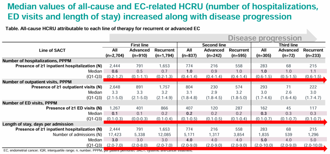表2:全因和EC相关HCRU的中位数(住院次数、急诊科就诊次数和住院时间)随着疾病进展而增加