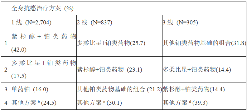 表:在第一至第三线全身抗癌治疗(SACT)中,最常见的三种方案如下