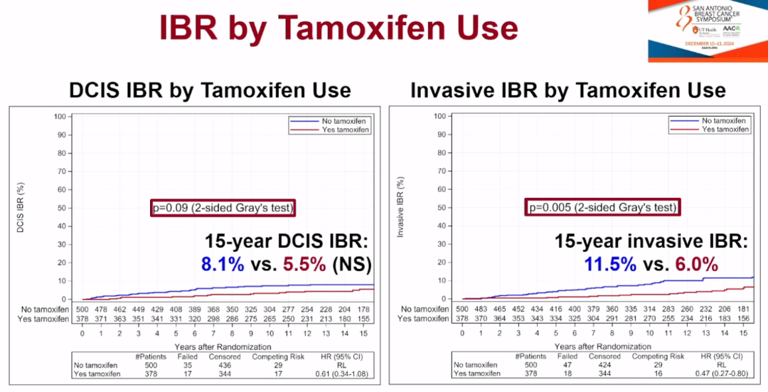 在辅助内分泌治疗方面也有“降阶梯”治疗的讨论。2024年SABCS大会报道的NRG Oncology/RTOG 9804和ECOG-ACRIN E5194联合分析显示,对于保乳术后的低危(低/中级DCIS,肿瘤≤2.5cm)患者,他莫昔芬(TAM)辅助内分泌治疗能够显著降低15年同侧乳房复发(IBR:19.0%vs 11.4%,P=0.001),但TAM应用主要与浸润性疾病的复发减少显著相关(11.5%vs 6.0%,P=0.005),而与导管原位癌(DCIS)的复发减少无显著相关(8.1%vs 5.5%,P=0.09)[5]。这些结果表明针对低危的DCIS患者,在免除辅助放疗的基础上进一步免除TAM辅助内分泌治疗是有讨论空间的,未来或可结合其他手段来筛选出降阶梯的获益人群。