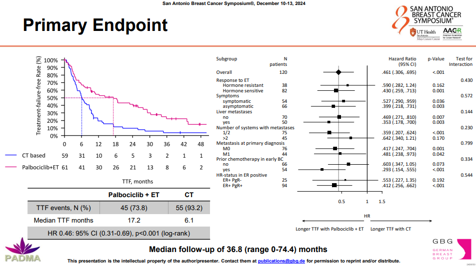 [11]Sibylle Loibl,et al.Primary results of the randomised phase IV trial comparing first-line ET plus palbociclib vs standard mono-chemotherapy in women with high risk HER2-/HR+metastatic breast cancer and indication for chemotherapy-PADMA study