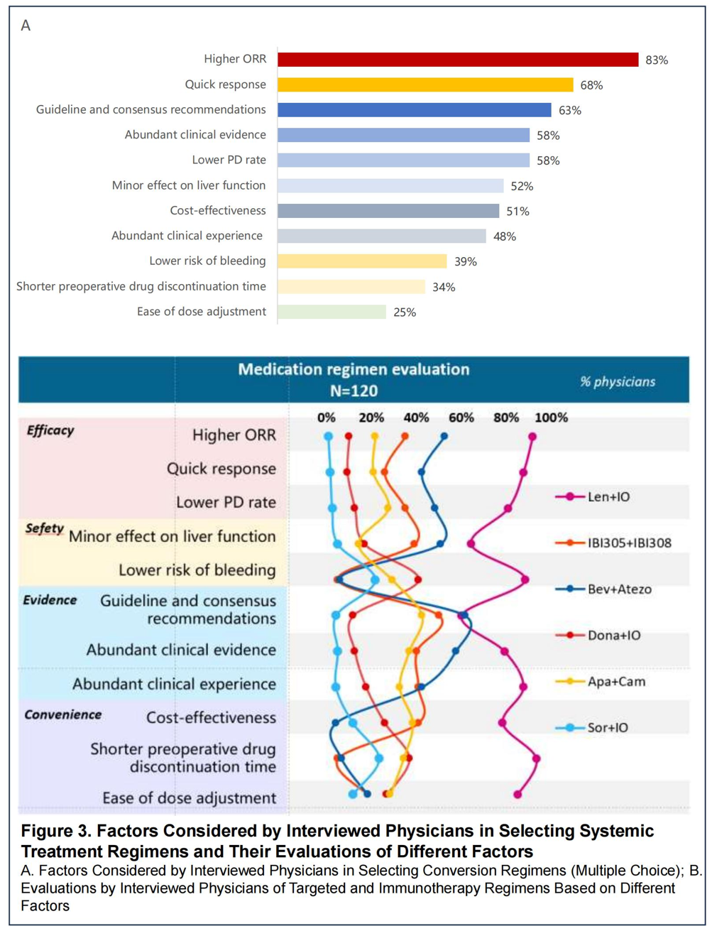在选择系统治疗方案时,83%(99/120)的调研医生优先考虑的是较高的客观缓解率(ORR),疾病快速缓解(68%,82/120)、其次是遵循指南和共识(63%,76/120)以及较低的肿瘤进展率(58%,70/120)等。在靶免治疗方案评价方面,调研医生普遍认为仑伐替尼联合免疫治疗方案在疗效、安全性、循证医学证据、便捷性方面的评分均相对较高。