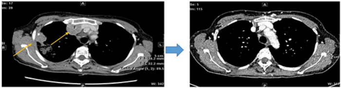 图:患者接受奥希替尼+阿来替尼联合治疗2个月前后的胸部CT扫描图