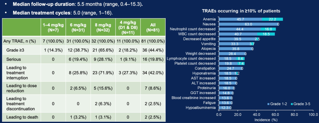 唐碧霞教授:本研究纳入了既往治疗失败的患者(其中大部分为多线治疗失败),共入组81例。疗效结果显示,在有效剂量组中,6mg和8mg剂量组的客观缓解率(ORR)分别为41.9%和50.0%,疗效持续时间分别为7.6个月和5.5个月,无进展生存期(PFS)均为5.8个月。目前,总生存期(OS)数据尚不成熟。已有的这些数据表明,该药物具有进一步探索的潜力。