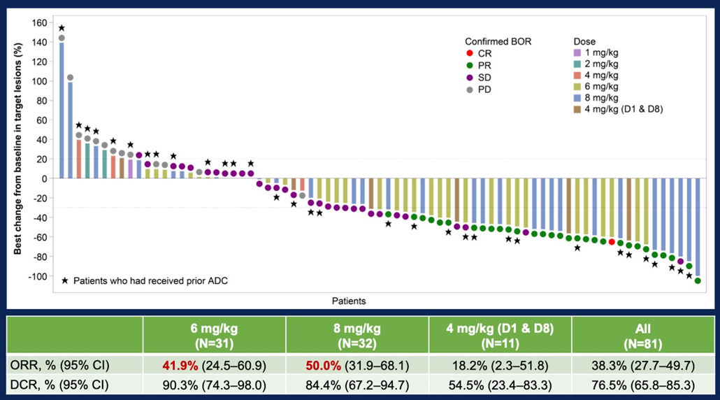 特别令人兴奋的是,在这81例患者中,虽然46%的患者既往经过ADC治疗(主要是维迪西妥单抗)失败,但在这部分患者中,该药物6mg组仍实现了超过50%的客观缓解率。这一结果对于国内患者群体尤为重要,因为对于那些化疗失败且维迪西妥单抗治疗失败的患者,有效的治疗手段较为有限。因此,这一在研药物为这些患者提供了新的治疗希望。