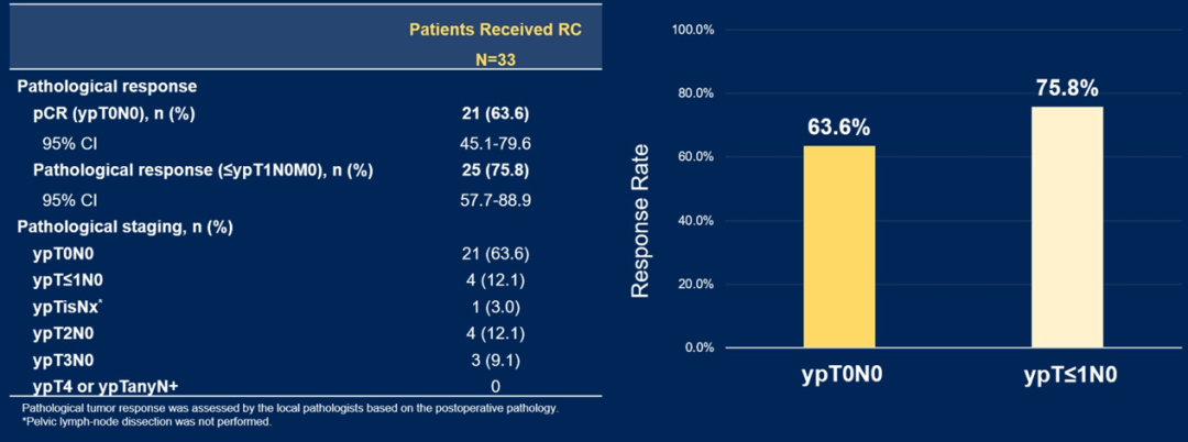 目前,单独使用免疫治疗、单独使用ADC药物以及免疫联合化疗所取得的pCR率基本在30%~50%之间。而我们研究团队今天公布的结果显示,整体患者人群的pCR率达到了63.6%,这是在大会讨论中所展示的一系列研究中最高的pCR率。如此高的有效率,结合后续的手术及术后辅助免疫治疗,有望使MIBC的疗效取得质的飞跃。此外,鉴于此方案疗效显著,未来我们还可能针对特定患者群体开展保膀胱的治疗策略,这些研究将为未来的治疗提供新的思路和方向。