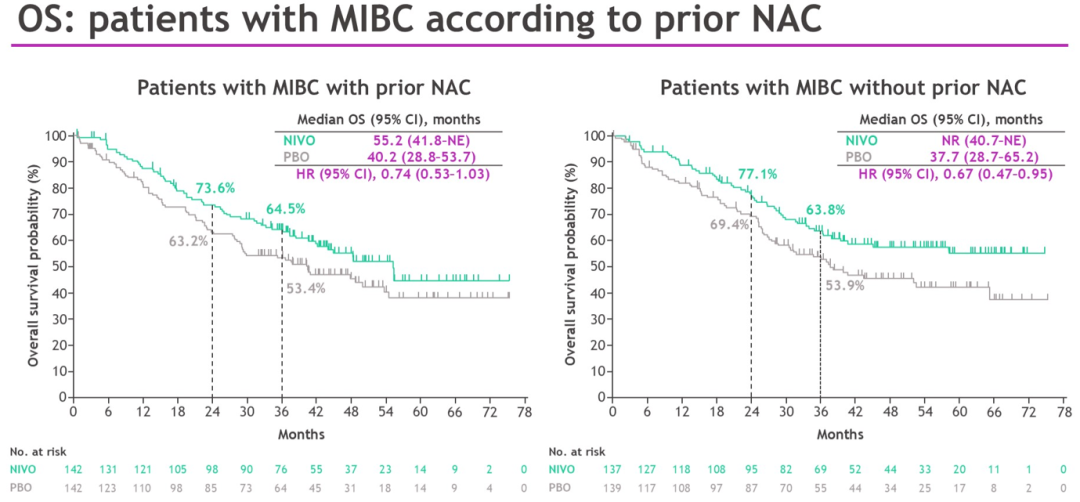 另一方面,CheckMate 274研究评估了纳武利尤单抗对比安慰剂在根治术后高复发风险MIBC患者中的疗效与安全性。研究结果显示,纳武利尤单抗在DFS和OS方面均取得了明显改善。本届ASCO GU年会也报道了相关OS分析数据,包括全体人群及亚组分析结果。基于其疗效表现,纳武利尤单抗已获得我国及欧美多个国家的适应症批准。