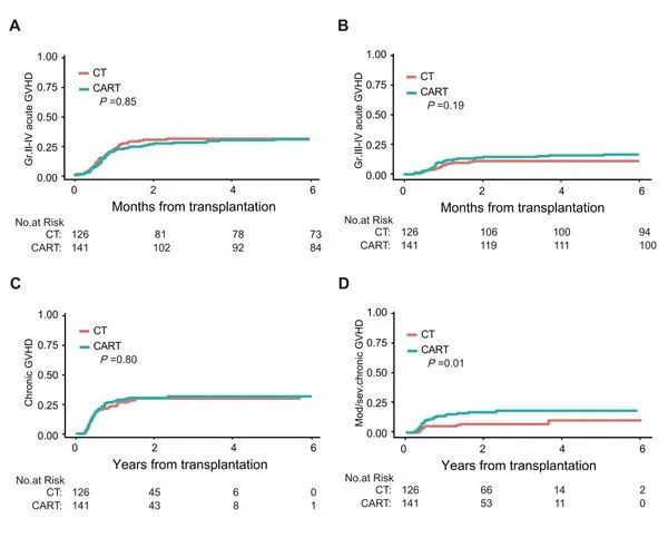 CAR-T治疗能消除allo-HSCT前的MRD,OS和RFS与化疗组相似。但CAR-T-allo-HSCT组患者mod/sev cGVHD的发病率更高。在CR1亚组中,与化疗-allo-HSCT组相比,CAR-T-allo-HSCT组的预后较差。CAR-T治疗和allo-HSCT间隔超过61天的患者GRFS更高、Ⅱ-Ⅳ级aGVHD和Ⅲ-Ⅳ级aGVHD的发病率更低。