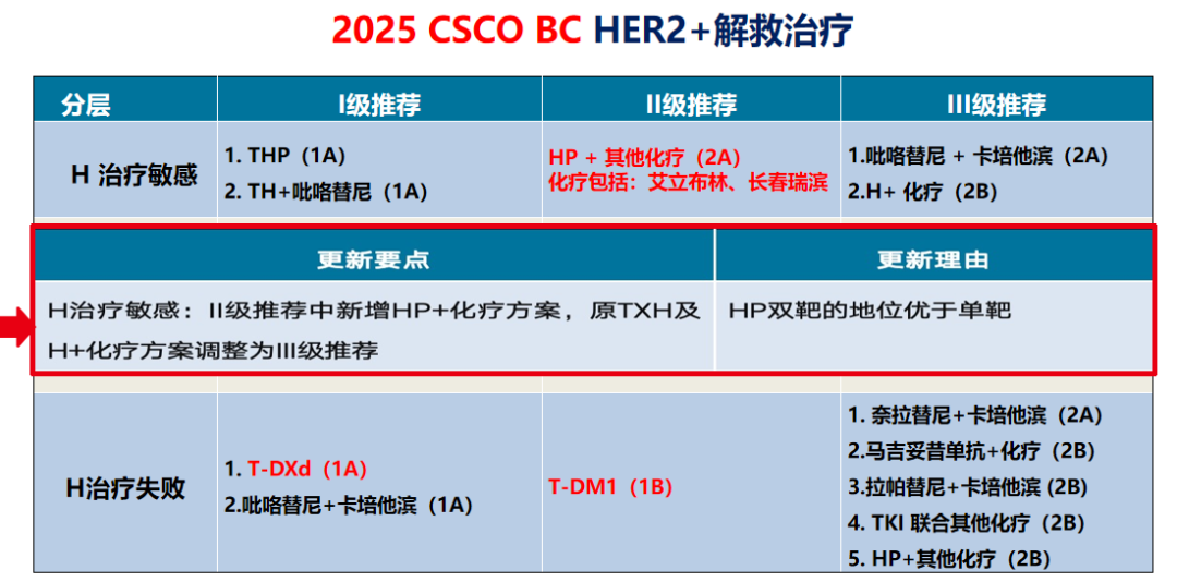 在Ⅱ级推荐方面,2024年指南中T-DM1为1A类证据,2025年《CSCO BC指南》将其调整为1B类证据,这体现了在治疗过程中,可优先选择T-DXd以及国产原研的吡咯替尼联合卡培他滨方案,T-DM1依然是次选。