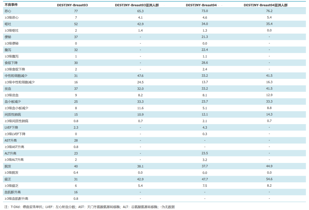 图2.不同研究中T-DXd治疗乳腺癌的常见不良事件发生率(%)