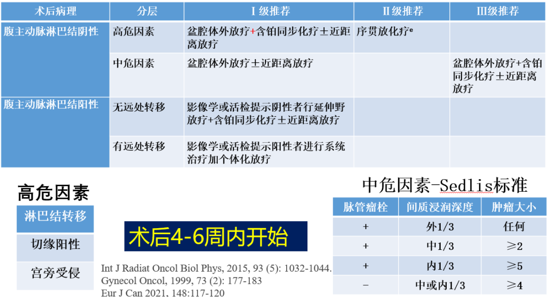 NRG Oncology/GOG-263研究:GOG-263研究是在中危早期宫颈癌患者开展的根治性子宫切除术及淋巴结切除术后辅助放疗对比放化疗的随机III期试验。结果显示,对于接受根治性子宫切除术后具有中等风险因素的宫颈癌患者,辅助放疗联合顺铂化疗并未改善无复发生存(RFS)或总生存(OS)。此外,在放疗期间加入顺铂化疗显著增加3级以上毒性反应。