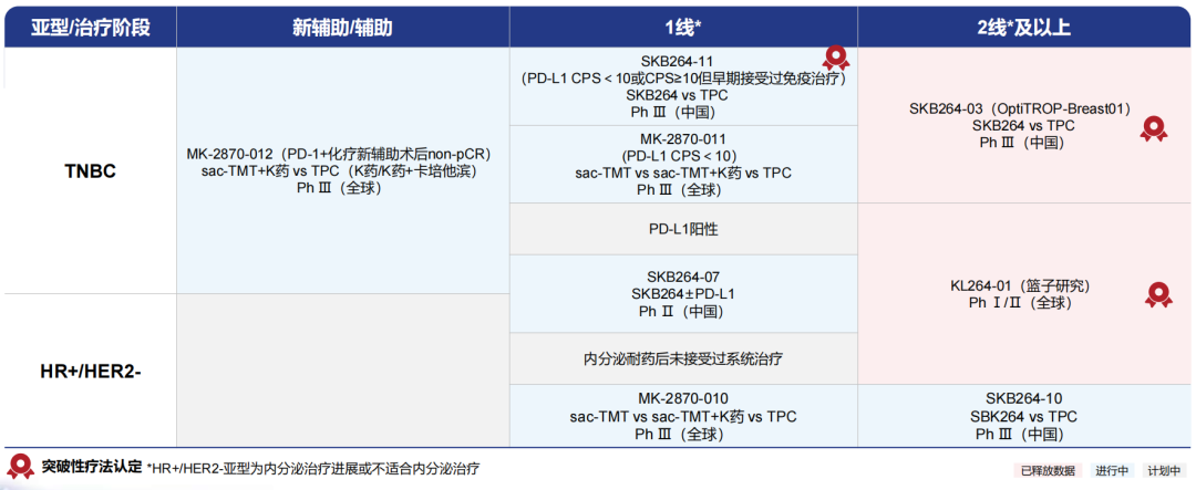 芦康沙妥珠单抗的治疗应用,已经从晚期TNBC拓展至HR+/HER2-晚期乳腺癌,临床试验布局从晚期后线拓展至晚期一线治疗、早期(新)辅助治疗,治疗模式也包含单药或联合治疗,将构建完整的HER2-乳腺癌全程治疗格局,这些临床试验有望进一步满足患者的治疗需求,使芦康沙妥珠单抗成为HER2-乳腺癌系统治疗的基石药物。