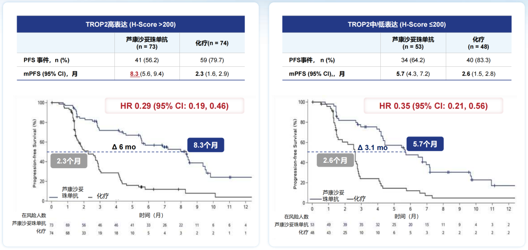 △OptiTROP-Breast01研究:BICR评估的PFS及不同TROP2表达水平患者的PFS