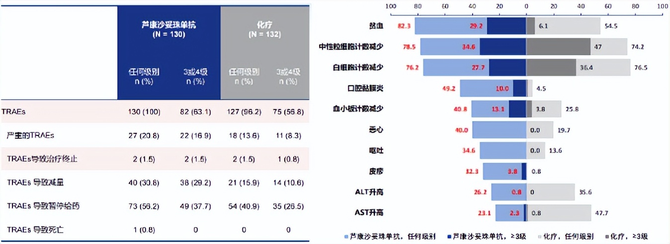 芦康沙妥珠单抗组的安全性同样表现出色,在中位暴露持续时间三倍于化疗组的情况下,两组的≥3级治疗相关不良事件(TRAEs)发生率相似,仅1.5%的患者因TRAE导致芦康沙妥珠单抗治疗终止。芦康沙妥珠单抗较为常见的≥3级TRAE是中性粒细胞减少、贫血等血液毒性。