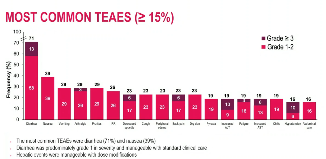 最常见的治疗期间不良事件(TEAE)为腹泻(71%)和恶心(39%)。最常见的≥3级TEAE为腹泻(13%)、ALT升高(10%)及高血压(10%)。2例(6%)患者因TEAE停用图卡替尼,但继续接受曲妥珠单抗治疗,无TEAE相关死亡事件。