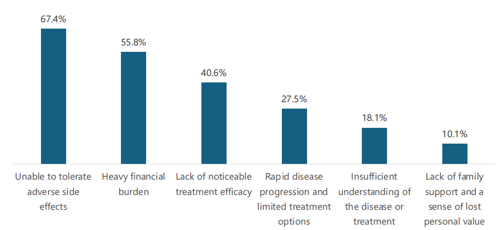 对患者治疗意愿的深入分析显示,导致患者考虑停止治疗的最显著因素是无法忍受的治疗相关不良反应(67.4%)(图2)。值得注意的是,91.7%的患者面临心理健康问题,主要原因包括对疾病进展和治疗无效的担忧(64.5%)、对治疗不良反应的焦虑(53.3%)以及对身体形象改变的不满(44.8%)(图3)。