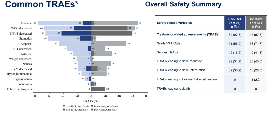 在安全性方面,芦康沙妥珠单抗也表现出较好的优势,≥3级治疗相关不良事件(TRAE)和严重TRAE的发生率均低于多西他赛组,且没有报告ILD事件,没有TRAEs导致的停药或死亡。