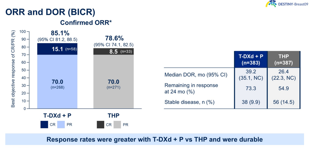 从近期疗效来看,T-DXd+P具有强效持久的肿瘤缓解效果。T-DXd+P组的ORR高达85.1%,高于THP组的78.6%;其中T-DXd+P组的完全缓解(CR)率相较于THP组提高了1倍(15.1%vs 8.5%);两组的中位持续缓解时间(DoR)分别为39.2个月26.4个月。这些数据再次证实了T-DXd具有强大的肿瘤退缩作用,优化传统化疗方案。尤其对于需要快速控制肿瘤的高瘤负荷患者而言,T-DXd能够起到“立竿见影”的效果,大大增强医生和患者的治疗信心。