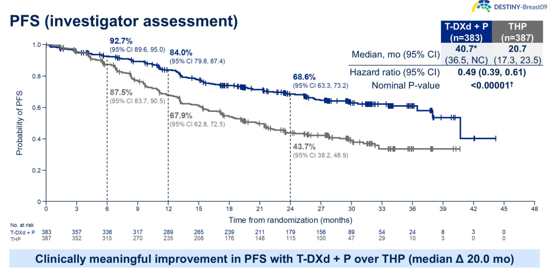 首先在主要终点方面,盲态独立评审中心(BICR)评估T-DXd+P组的中位PFS长达40.7个月,相较于THP组(26.9个月)显著延长13.8个月,疾病进展或死亡风险显著降低44%(HR 0.56,95%CI:0.44~0.71,P<0.00001)。长达40.7个月的中位PFS,是目前HER2+ABC一线治疗III期研究的最长PFS,意味着患者可以通过此方案可获得长期的疾病控制,有望实现高质量的长期生存。而在研究者评估的PFS中,T-DXd+P组显著延长了20个月(40.7 vs 20.7个月,HR 0.49,95%CI:0.39~0.61,P<0.00001)。
