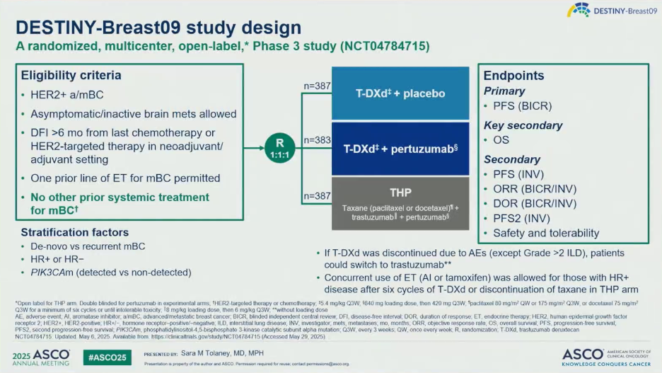 Sara M.Tolaney教授再次分享了DB-09研究在ASCO大会发布的报告。该研究为一项全球多中心、随机、开放标签Ⅲ期临床研究,主要纳入既往未在晚期阶段接受过系统治疗(允许接受≤1线内分泌治疗)的HER2阳性晚期乳腺癌患者,按1:1:1随机分组后予以T-DXd单药治疗、T-DXd+帕妥珠单抗(P)以及THP标准治疗方案。主要终点是通过盲态独立中心评估(BICR)的无进展生存期(PFS)。次要终点包括研究者评估的PFS、总生存期(OS)、客观缓解率(ORR)、安全性等。