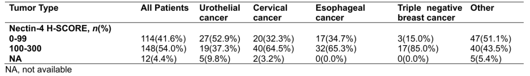 该研究共纳入274例实体瘤患者,(0.33mg/kg,n=1;1.0mg/kg,n=3;1.25mg/kg,n=254;1.5mg/kg,n=16),包括51例UC,62例CC,49例EC,20例TNBC和92例其他实体瘤。安全性总体可控,1.5mg/kg组观察到1例DLT,为持续超过5天的4级中性粒细胞减少症,在所有剂量组中均未达到MTD,常见(≥20%)治疗相关不良事件(TRAE)详见表2。在1.25mg/kg剂量组中,3.9%的患者因TRAE导致治疗中止,22.0%患者因TRAE降低剂量,主要原因为中性粒细胞计数减少(7.1%)、白细胞计数减少(5.1%)、周围感觉神经毒性(4.7%)及皮疹(3.5%)。该组SAE发生率为27.6%,最常见的为中性粒细胞计数减少(5.9%)和白细胞计数减少(5.1%)。最终,研究确认1.25 mg/kg为推荐剂量。