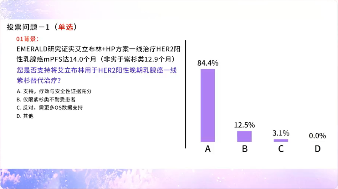 基于EMERALD研究,高达84.4%的专家支持将艾立布林替代紫杉用于HER2+晚期乳腺癌一线治疗;在临床实践中,专家会基于分子分型(32.8%)、有无内脏转移(26.6%)、肿瘤负荷(28.1%)等因素来选择艾立布林,肯定了艾立布林具有高效、快速控制肿瘤的作用;再者,基于当前循证医学证据,有高达83.3%的专家将艾立布林作为紫杉耐药患者的优选方案;尤其在TNBC患者中,近七成(68%)专家支持将艾立布林作为紫杉进展后的首选方案;针对HR+乳腺癌患者的晚期化疗时机,除了内脏危象(20%)和内脏转移且肿瘤负荷高(28%)等需要快速解救治疗的患者以外,也有相当比例(28%)的专家支持化疗是CDK4/6i经治后的重要选择。