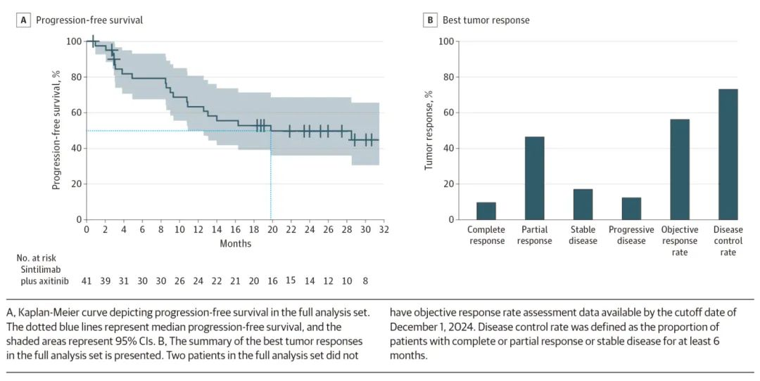 研究中患者接受信迪利单抗200 mg,每3周静脉注射一次,联合阿昔替尼5 mg,每日两次口服,直至病情进展、出现无法耐受的毒性作用或患者撤回知情同意。研究主要终点为客观缓解率(ORR)和无进展生存期(PFS)。次要终点包括安全性、总生存期、疾病控制率(达到完全或部分缓解或病情稳定≥6个月的患者比例)、缓解持续时间以及探索性基因组相关结局。