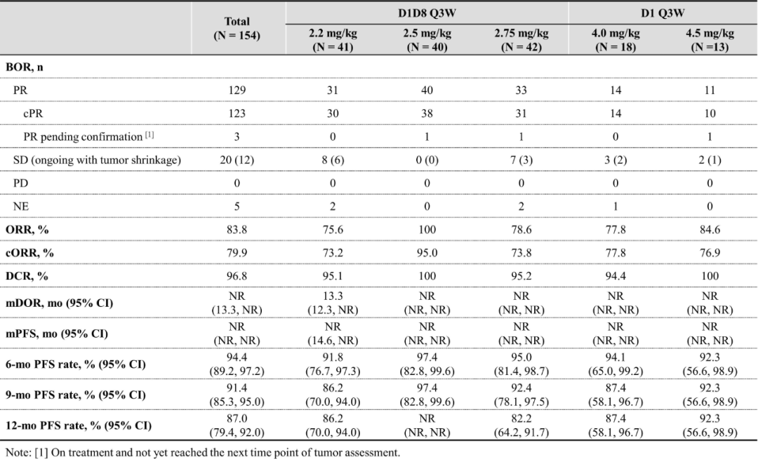 研究结果:截至2025年3月10日,共有154例患者接受iza-bren联合奥希替尼治疗,中位随访时间为11.3个月。所有至少接受过一次iza-bren治疗的患者均纳入本次分析(详见下表)。
