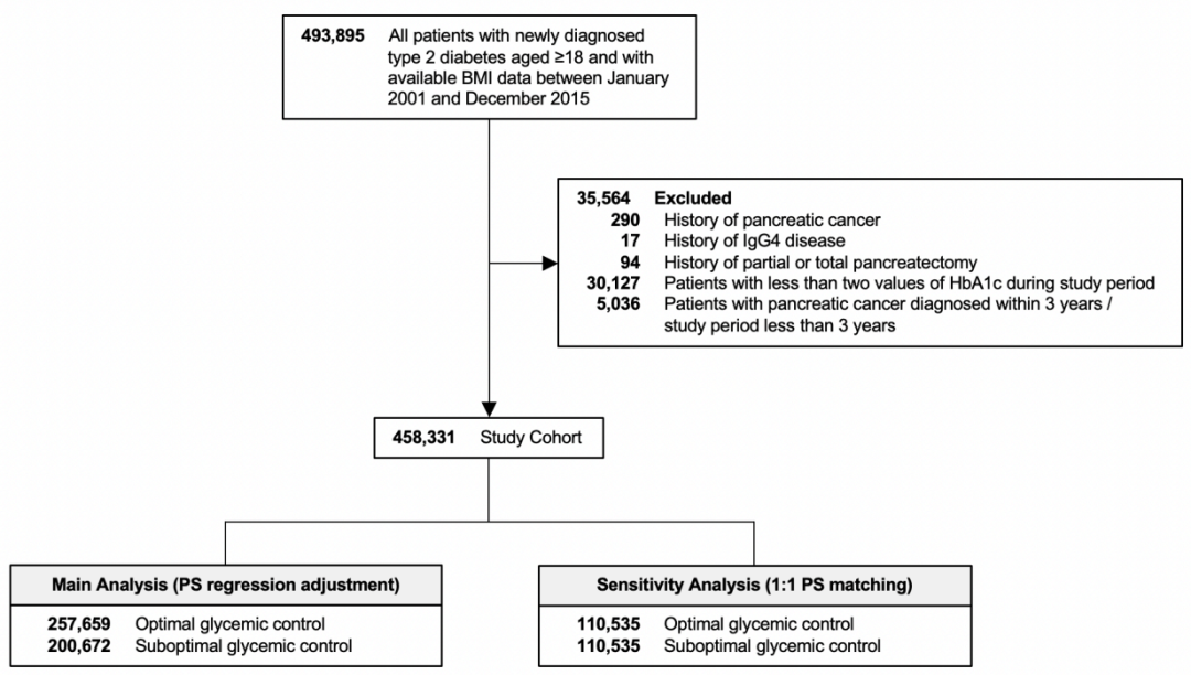 纳入标准为2001-2015年新诊断的T2D患者(≥18岁),具备体重指数(BMI)数据,且至少有2次HbA1c测量记录。此外,为避免反向因果,排除T2D诊断后3年内确诊胰腺癌的患者;同时排除既往胰腺癌、IgG4相关性疾病、胰腺切除术史以及随访时间不足3年的患者(图1)。