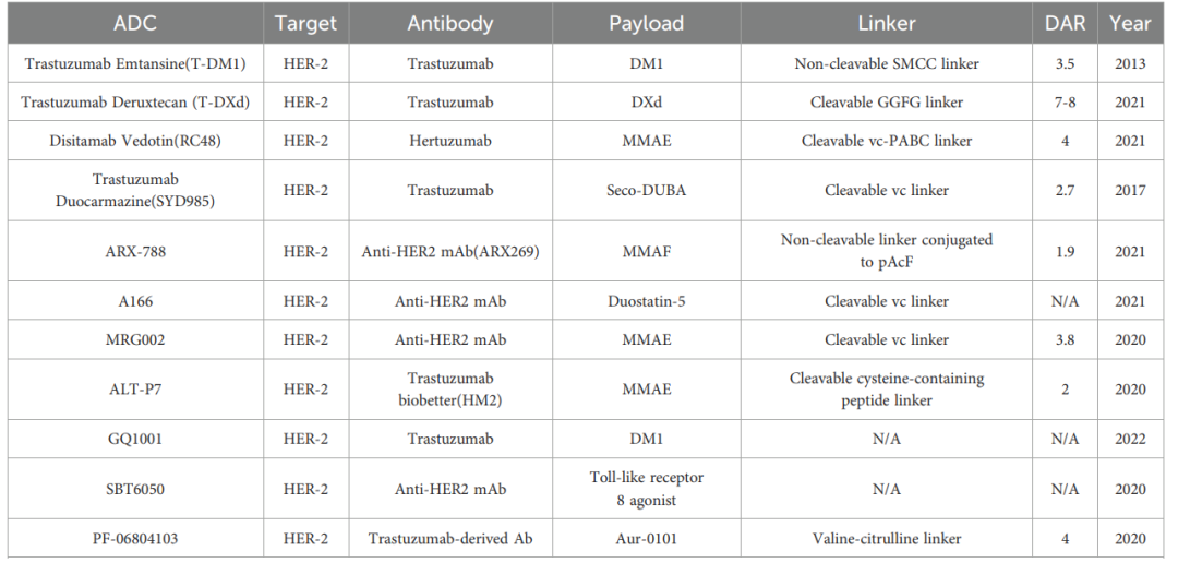 表1.用于HER2靶向治疗的ADC药物