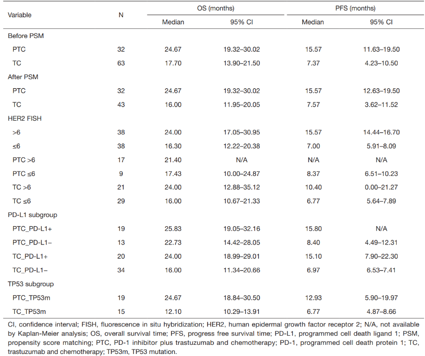 与在HER2阴性胃癌中的发现不同,本研究显示,无论PD-L1表达阳性(CPS≥1)或阴性(CPS<1),两组患者的OS均无显著差异。然而,在PTC组内,PD-L1阳性患者的PFS优于PD-L1阴性患者(中位PFS 15.80个月vs.8.40个月)(图4,表1),但这一优势并未转化为OS的显著差异。这表明对于HER2阳性胃癌,PD-L1可能不是决定免疫联合治疗长期获益的主导生物标志物。
